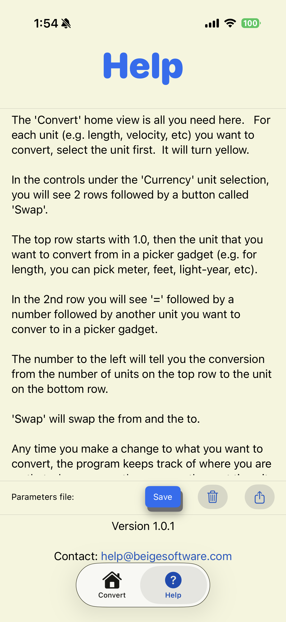 This app contains two views: a "Home" view for the conversions, and a "Help" view which basically has this information: