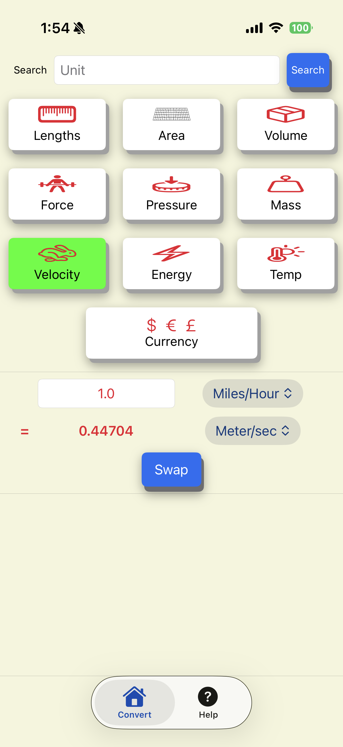 The "Swap" button will swap the conversion. For instance, the above has conversion of "Miles/Hour" into "Meters/sec". If you click "Swap", it will convert from "Meters/sec" to "Miles/Hour".